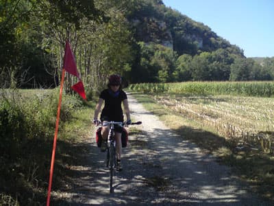 At the bottom of the hill we turned over the bridge to come out at Corn. Unfortunately the last few kilometers weren't as pleasant going back as they had been on the way out. They were laying fresh tarmac and had sprinkled gravel over everything that they hadn't rolled in. Consequently it was difficult to ride on and worrying whenever a car sped past in the opposite direction. But we made it.